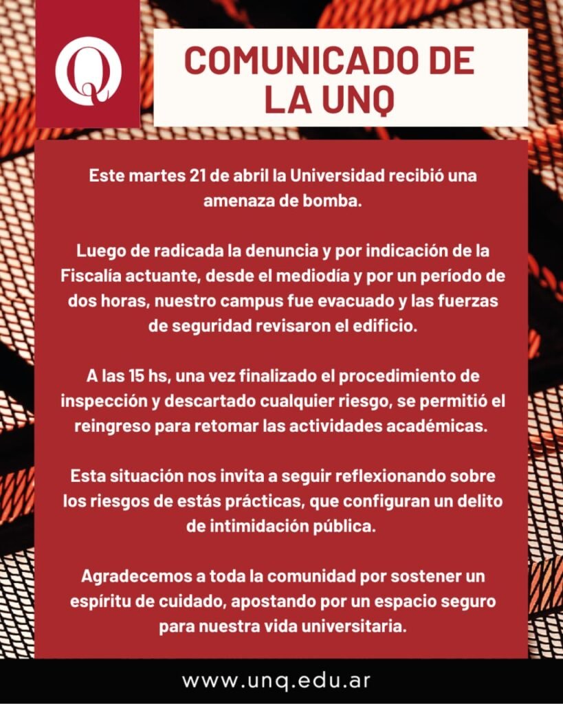 Una situación de tensión se vivió en la Universidad Nacional de Quilmes, ubicada en Bernal, cuando una amenaza de bomba obligó a evacuar de forma inmediata a estudiantes, docentes y personal administrativo.