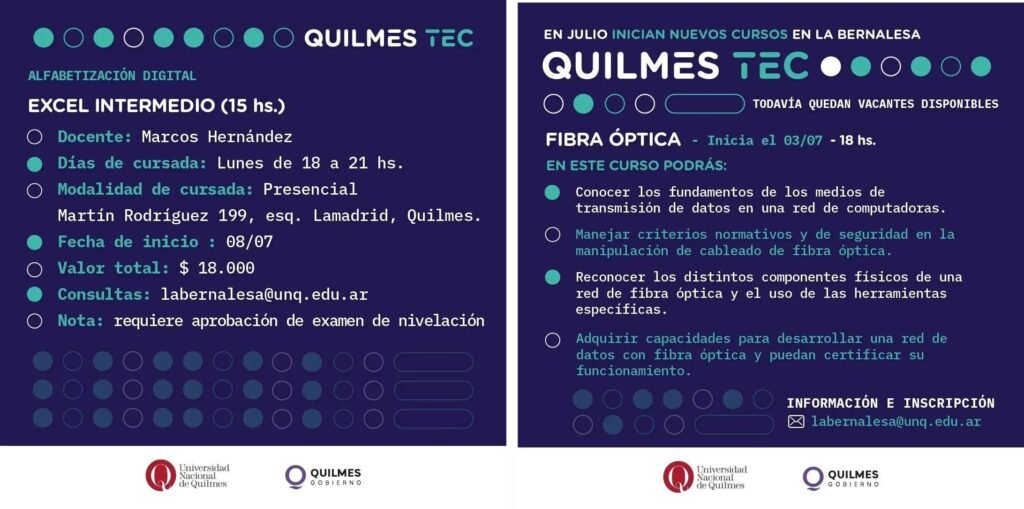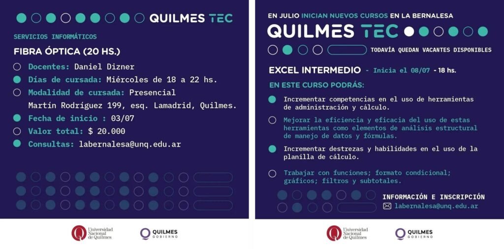 El Municipio de Quilmes informa que el 3 y 4 de julio arrancan nuevos cursos intensivos de Quilmes TEC en la sede de La Bernalesa, ubicada en Martín Rodríguez 199, esquina Lamadrid, en la zona oeste del distrito, dirigidos a quienes quieran aprender sobre fibra óptica y el programa Excel intermedio.