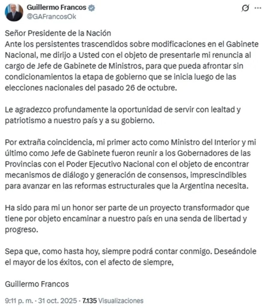 En el texto, Francos expresó que su decisión respondía a la necesidad de que el mandatario pueda encarar “sin condicionamientos” la nueva etapa de gobierno posterior a las elecciones del 26 de octubre. “Le agradezco profundamente la oportunidad de servir con lealtad y patriotismo a nuestro país y a su gobierno”, manifestó.