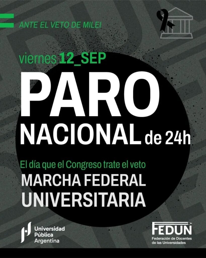 La Federación de Universidades Nacionales (FEDUN) confirmó un paro de 24 horas para este viernes en todas las casas de estudio del país. Además, junto al Frente Sindical Universitario, anunciaron una nueva Marcha Federal coincidiendo con el día en que el Congreso busque revertir el veto presidencial.