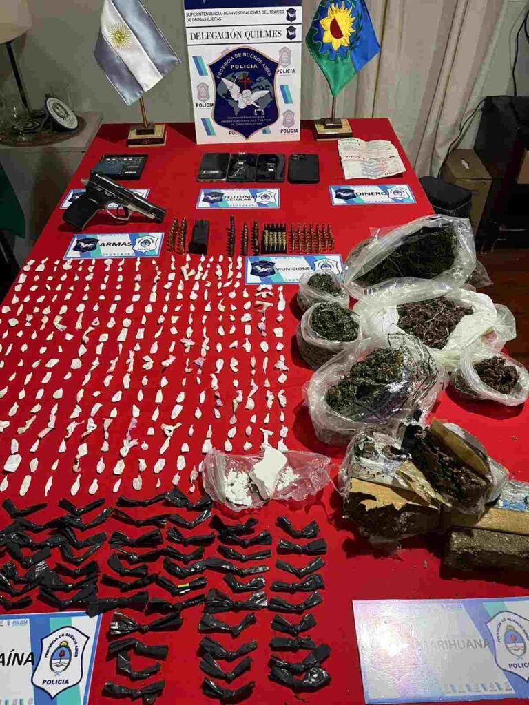 Durante los operativos, se detuvo a dos hombres de 34 y 26 años, y a una mujer de 24. En los inmuebles se encontraron 602 gramos de cocaína fraccionada, más de 2,8 kilos de marihuana, y 113 gramos de pasta base. También se hallaron una pistola Bersa 9 mm —con pedido de secuestro desde 2017—, 108 municiones de distintos calibres, una balanza de precisión, celulares y $87.000 en efectivo.