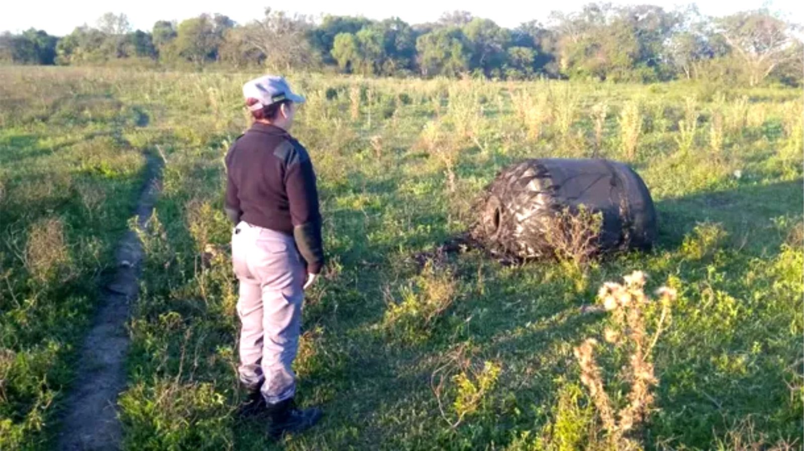 El hallazgo se produjo cerca de las 18.15 en el Campo Rossi, propiedad de Ramón Ricardo González. El cilindro medía 1,70 metros de largo por 1,20 de diámetro y estaba fabricado en fibra de carbono, un material empleado en la industria aeroespacial. Presentaba un orificio de 40 centímetros en un extremo, un sistema de válvulas en el otro y un número de serie grabado en su superficie. Los expertos confirmaron que contenía residuos de hidracina, un combustible altamente tóxico, lo que llevó a perimetrar la zona y restringir el acceso, custodiado por Bomberos.